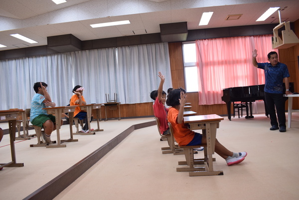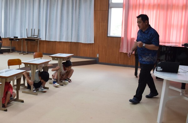 講話の後は、不審者、地震、火災、津波のそれぞれの避難の仕方についてクイズや動画視聴、実際に起こった事件や災害についての記事の紹介等をしながら、万が一に備えて訓練をしておくことの重要性についてもお話していただきました。