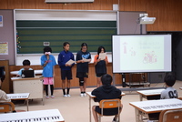 朝会では、5・6年生の全員が、赤い羽根共同募金の歴史や募金の使われ方について説明し、本校で今日からスタートする募金活動への協力を呼びかけました。
