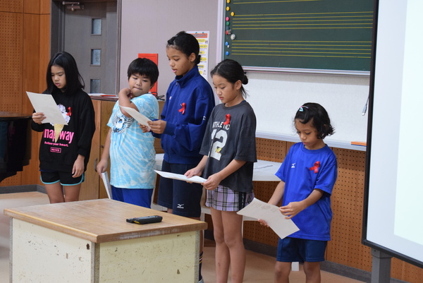 12月2日(火)、保健委員会の5名が、保健集会で「世界エイズデー」についての発表を行いました。