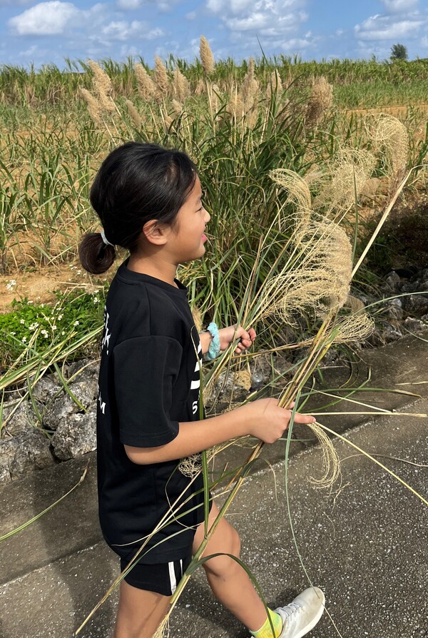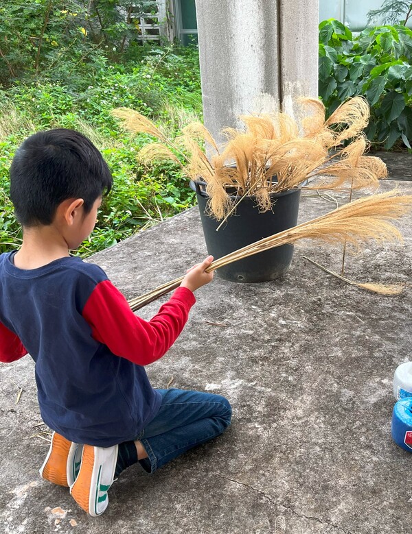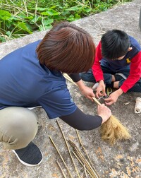 3年生の児童は2名。まずは材料となるススキを自分たちで採りに行くところからスタートです。ススキの大きさや状態をじっくり観察し、「どう組み合わせれば使いやすくなるかな?」と試行錯誤しながら形を整えていきました。