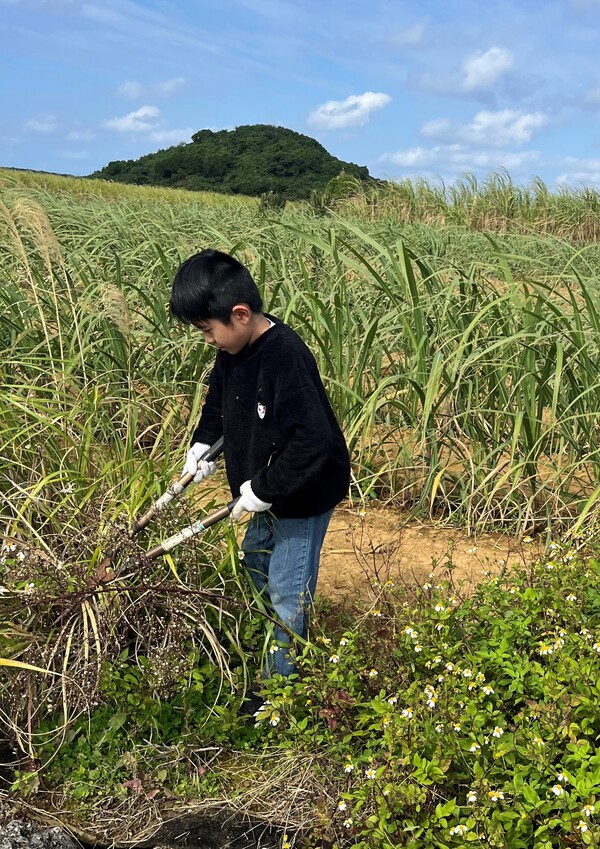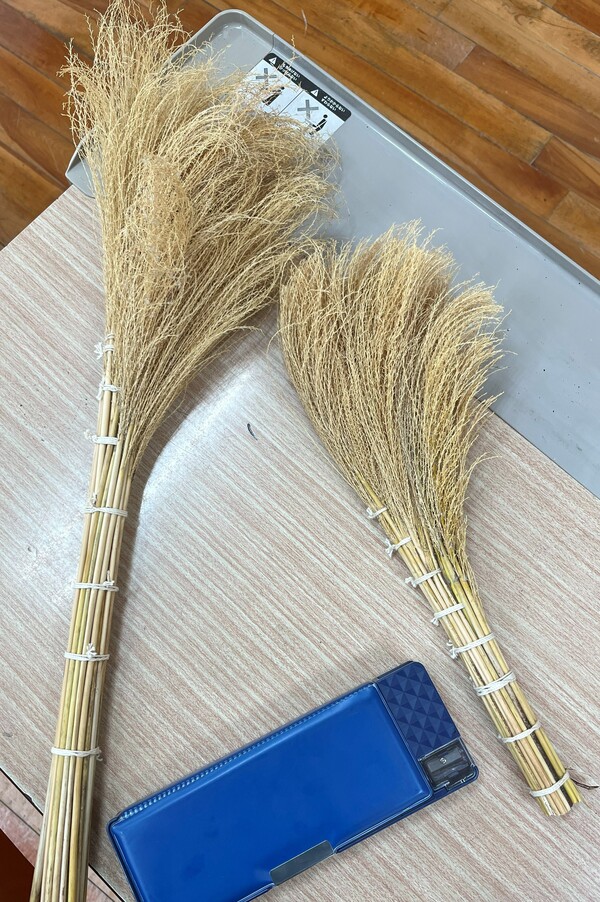 最も難しかったのは、バラバラのススキを紐できつく結ぶ工程です。力が必要な作業に苦戦する場面もありましたが、先生方にも協力してもらいながら見事なほうきが完成!自分たちの手で道具を作り上げた喜びに、二人とも満面の笑みを浮かべていました。