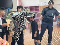 獅子にかんでもらいたい園児が集まり、会場は笑顔に包まれ、ほのぼのとしたひとときとなりました。最後は、みんなで記念撮影をして交流会を締めくくりました。