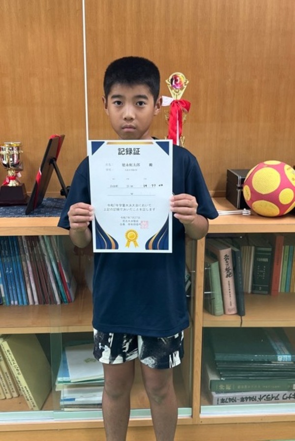 7月に開催された「学童水泳大会」の入賞者に賞状とメダルを9月3日に授与しましたが、手違いで一人の児童の入賞および賞状が行方不明でした。本日、その賞状を改めて德永虹太郎君に授与しました。虹太郎君、賞状の手違いで渡すのが遅くなってすいませんでした。改めて、おめでとうございます。