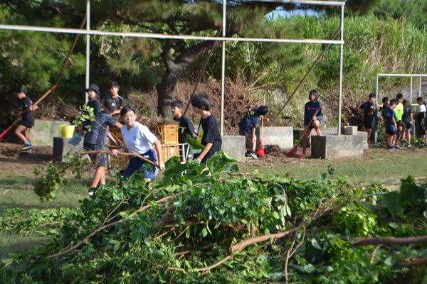 学年ごとに分かれて、トラックの小石を拾ったり、草刈り後の草を集めたり、伐採した木々をまとめたりと、それぞれが役割を果たしながら、全員で気持ちを一つに「協力」「全力」で運動場づくりに取り組みました。