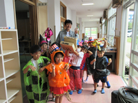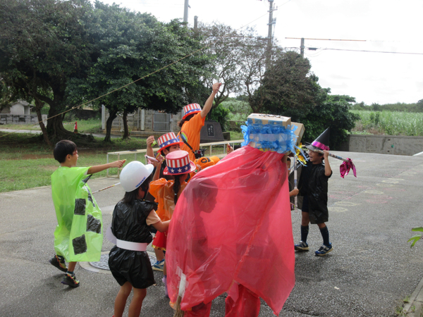 カラフルなマントに魔女の帽子、カボチャやおばけ、まもるくん、シーサー等の衣装を身にまとった幼稚園の子どもたちです。