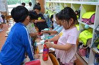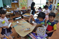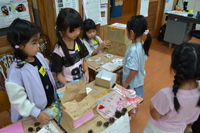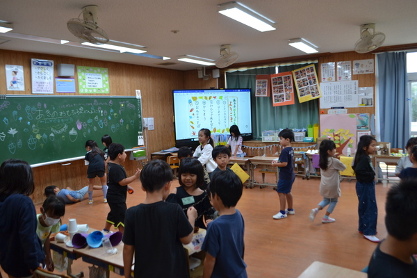 久松幼稚園の園児達を招いて、「あきのおもちゃランド」をひらきました。1年生は「秋となかよし」の学習で見つけた秋の植物を使って、「幼稚園生が楽しんでくれるおもちゃ」を工夫を凝らして制作してきました。当日の朝には、「幼稚園生にやさしく声をかける」「幼稚園生が安全に楽しく遊べるようにがんばる」など、一人一人がめあてをもって臨みました。幼稚園生も最初は緊張した様子でしたが、1年生が「おいで」「いっしょにやろう」といった声かけをしていくなかで、徐々に笑顔が増え、1年生とおもちゃを楽しむ様子が見られました。幼稚園生が帰った後には、「最初は緊張したけど、自分からがんばって話しかけたら仲良くなれた。」「楽しかったから、また幼稚園生と遊びたい。」とふりかえっていました。