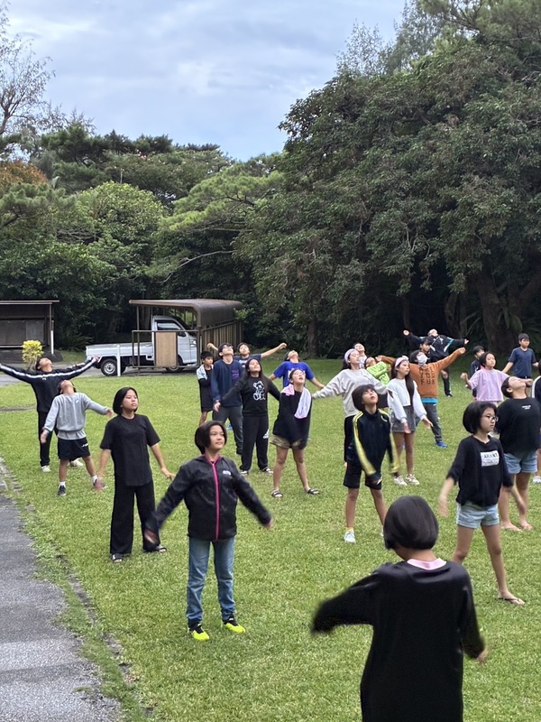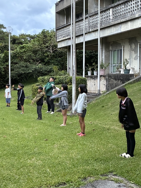 男子は5時頃から起きていた子もいました。みんな静かにぐっすり眠ったようで、芝生上での体操も気持ちよくできましたね。