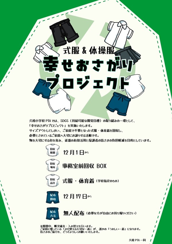 久松小学校PTAでは、SDGs(持続可能な開発目標)の取り組みの一環として、「幸せおさがりプロジェクト」を実施しています。 サイズアウトしてしまい、ご家庭で不要となった式服・体育着を回収し、必要とされているご家庭へ大切にお譲りする活動です。 物を大切にする心を育み、資源の有効活用と保護者の皆さまの負担軽減を目的としています。