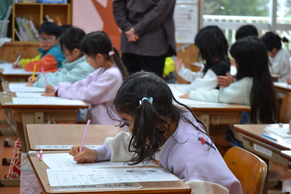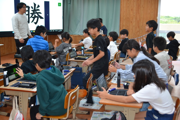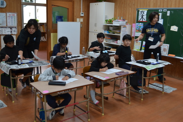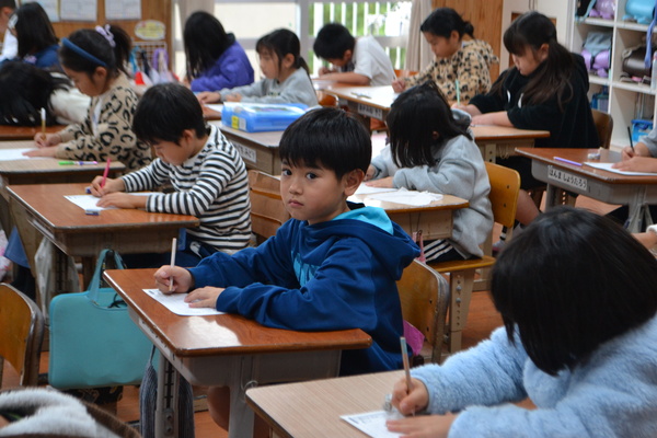 教室では、どの学年の子供たちも姿勢を正し、真剣な表情で硬筆(1・2年)や毛筆(3~6年)に取り組んでいました。