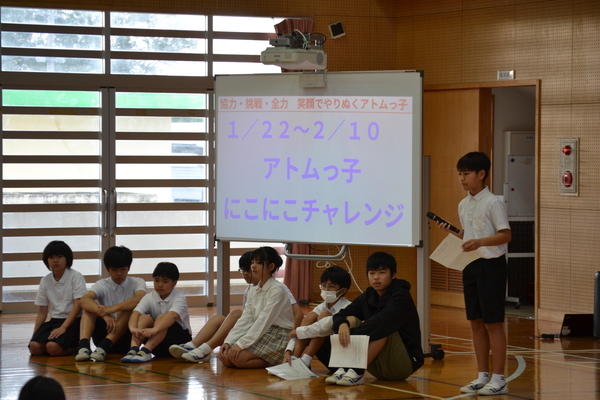 今年度は、児童会スローガンを意識しながら、学級(全児童)と児童会をつなぐ取組として、「挨拶運動」や「運動会前のみんなで清掃」、「ニコニコチャレンジ」などを企画・実施することができました。自分たちで考え、全校に働きかけ、形にしていく経験は、子どもたちにとって大きな学びとなったことと思います。
