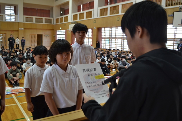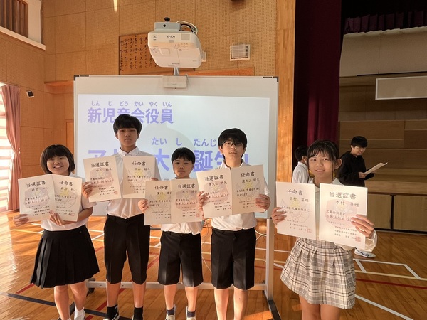 2月12日の朝会で、児童会役員任命式を行いました。これまでの活動の様子をスライドで振り返りながら、式が始まりました。旧役員代表と新役員代表がそれぞれ挨拶を交わし、バトンが引き継がれる大切な時間となりました。
