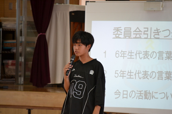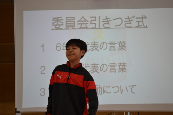 はじめに、旧児童会役員の6年生から、今年度の取組についての報告がありました。活動を通して学んだこととして、「一人一人の気持ちを考えること」や「あいさつの大切さ」が挙げられました。