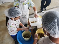 先日、仕込んだ麦麹菌はうまく生育できなかったため、講師の平良さんが育てた麦麹菌を使って味噌づくりを行いました。まずは、煮た大豆と麦麹菌、煮汁、塩、酒を混ぜ合わせます(写真①)。混ぜ合わせた原料を3つの練り機でグループごとに練りました(写真②、③、④)。その後、袋に入れて空気を抜き(写真⑤)、最後に保存室に保存しました。今回は、東京外国語大学大学院の5名の学生さんが取材に訪れてくれたので、一緒に味噌づくりを行いました。4ヶ月後、どんな「ユニムイ味噌」ができるか楽しみです。次回は、3学期に3回目の味噌づくりを行います。
