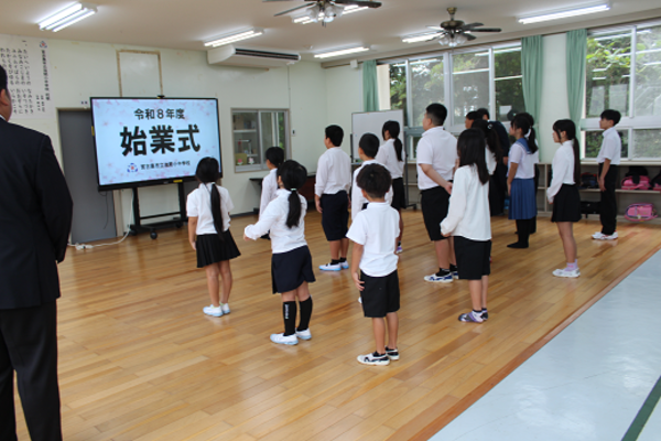 続く始業式では、校長先生から、「明るくあいさつをする」「楽しく学ぶ」「元気よく活動する」の3つのことについてお話がありました。進級した子どもたちの表情は、一つ上の学年になったという自覚に満ち、とても頼もしく見えました。