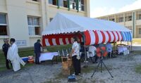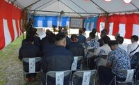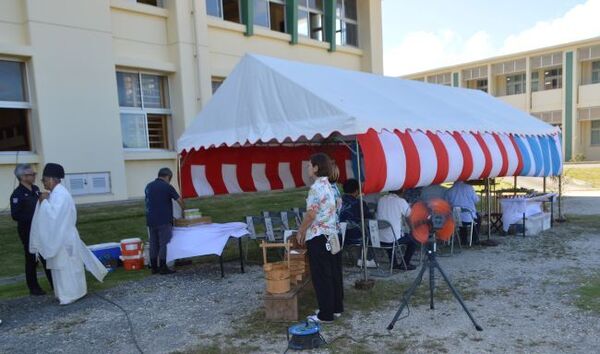 祈願祭には校長、教頭他、嘉数市長、宮城教育長など関係者が出席し、児童生徒の健やかな成長に向けて工事期間中の無事故・無災害を祈念しました。