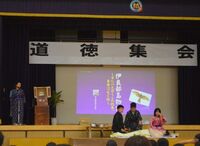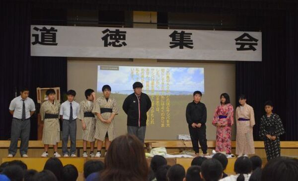 12月24日、本校では「小中学校合同道徳集会」を開催しました。これは小中一貫教育校である本校の特色を生かした異学年交流を通して、思いやりや感謝の心、愛校心や郷土への誇りを育むことを目的としたものです。