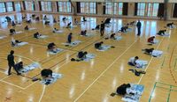 今日の「校内書き初め会」は、4・5年生が体育館で、3年生と6年生がそれぞれの教室で実施しています。