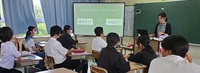 本校には初任者(英語)がいます。この日6/12(水)第1回の検証授業が実施されました。これまでの既習事項や学習内容をプレゼンテーションにまとめ、電子黒板で全体提示することで学習者は内容を理解しアクティビティが充実していました。
