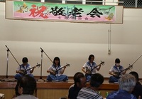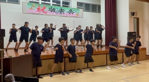 本校の郷土芸能同好会と1年生有志が地域の敬老会の舞台余興に参加しました。「三味線の音色」「躍動したダンス」に地域の老人たちは孫を見るかのように温かいまなざしを向けとても喜んでくれました。