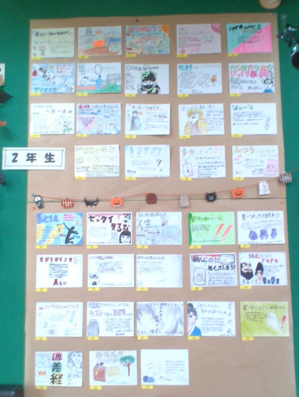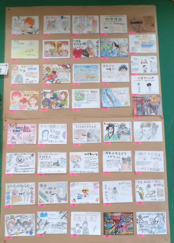 読書旬間の取り組みに一つに「校内POPコンテスト」があります。生徒一人一人が本に触れ、みんなに紹介したい本の宣伝としてPOPをつくるというものです。各学年、触れている本もそうですが、作成するPOPに個性が出ていて見ていてとても興味深いです。興味深い作品に投票をし、集計して対象を決定します。
