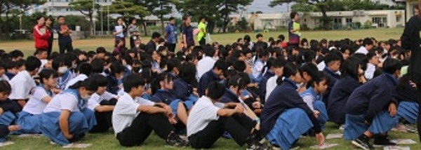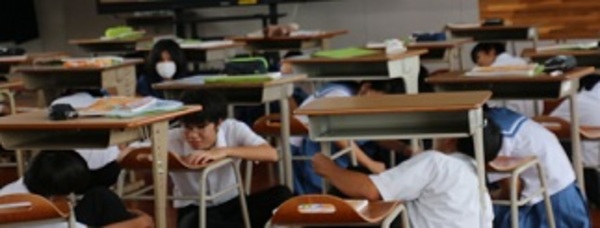 総合避難訓練の取り組みに合わせ、隣の幼稚園、小学校と合同で避難訓練を実施しました。シェイクアウト行動、おかしもちでの避難の実践に加え、出火の煙を想定しての避難経路の確保を確認しながらの訓練となりました。生徒たちは自助・共助を意識しながら真剣に取り組むことができました。いざというときの備えとても大切です。