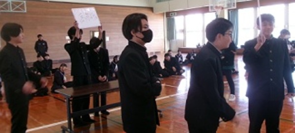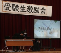 生徒会執行部主催で「受験生激励会」をしました。昨年度から内容が充実し、「受験に役立つクイズ大会」「受験生激励ムービー」が今回も大好評。クイズ大会では生徒会専門委員会の縦割り班で実施し、大いに盛り上がりました。激励ムービーは1・2年生それぞれが作成し、元気の出る歌の歌詞に合わせ激励メッセージが盛り込まれていました。これを糧に本校3年生は受験当日、素晴らしい力が発揮できそうです。