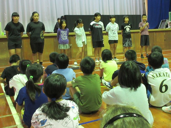 今日の朝会は、図書委員会の皆さんによる読書月間のお知らせと