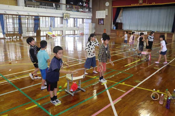 2年生が、ペットボトルや空き箱等を再利用しておもちゃをつくり、1年生を招待してゲームや競争を楽しみました。大盛り上がりでした。