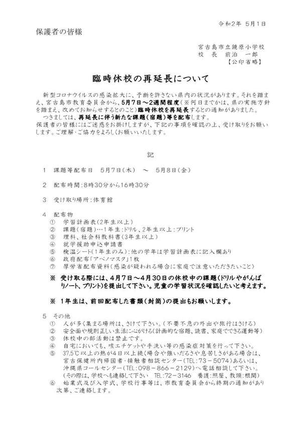宮古教育委員会から,5/7(木)~2週間程度臨時休校を再延長するとの通知がありました。