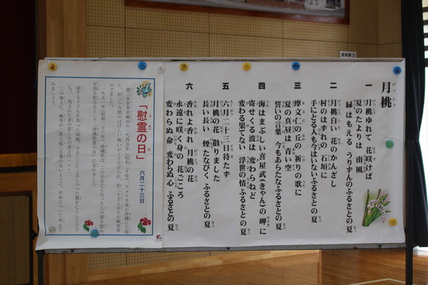 6月23日の慰霊の日を前に、全校児童で平和集会が行われました。