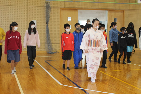 本校体育館にて、女流組踊り研究会「めばな」による組踊りのワークショップが行われました。