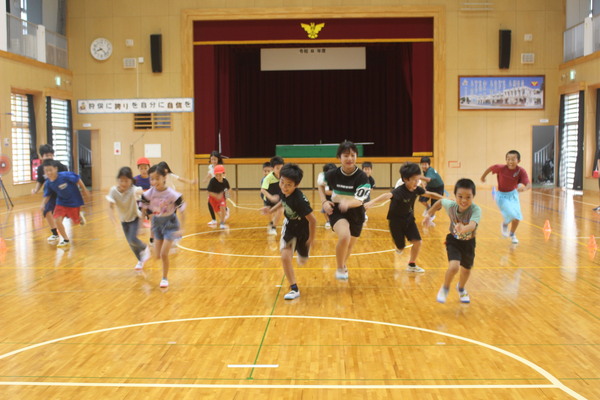 赤と青のチームに分かれ、体育館中央に一列に並び、呼ばれたチームがしっぽをとられるというゲームです。