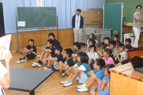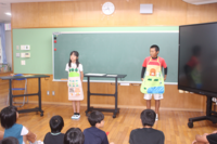 図書委員の2人が、エプロンを使って「オオカミと7匹の子ヤギ」と「おむすびころりん」を披露し、子供たちの笑顔いっぱいの朝会となりました