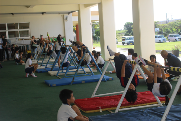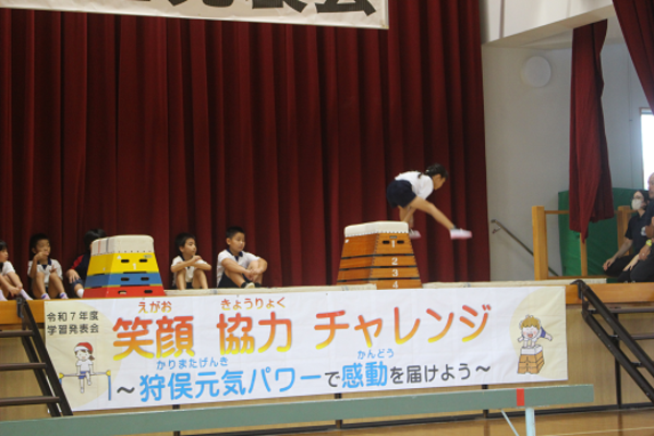 大きな声で会場を和ませてくれたあとは、体育で学んだ技を披露。マット運動や跳び箱に挑戦し、笑顔いっぱいの1.2年生でした。