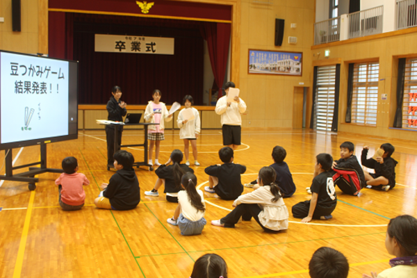 練習の後は、いよいよ本番の縦割り班対抗豆つかみゲームです。