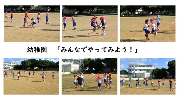 幼稚園は、「みんなでやってみよう!!」縄跳びを使った運動遊びです。みんな上手に跳べるようになってきました。当日はみんなでそろえてポーズを決めたいと思います。