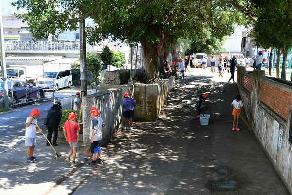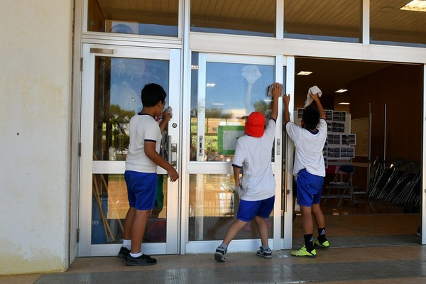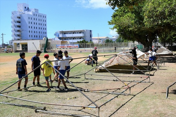 4年生は、東西の門周辺の清掃、5年生は玄関やプールトイレ、スタンド周辺の掃除、6年生はテント張りと外トイレ掃除、そして必要備品の準備等です。