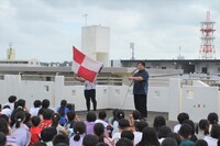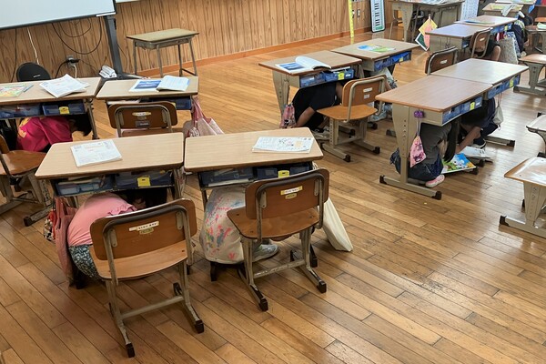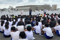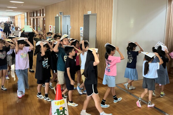 「授業中に震度4~5の地震が発生、机や腰掛けがガタガタ揺れ動く。しばらくすると大きな揺れはおさまるが余震は、なお続き津波の恐れもあることから一刻も早く児童を安全な場所に避難誘導する必要がある。」という想定のもと、しっかりと事前学習をしてから臨みました。