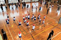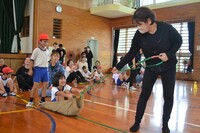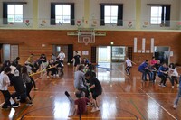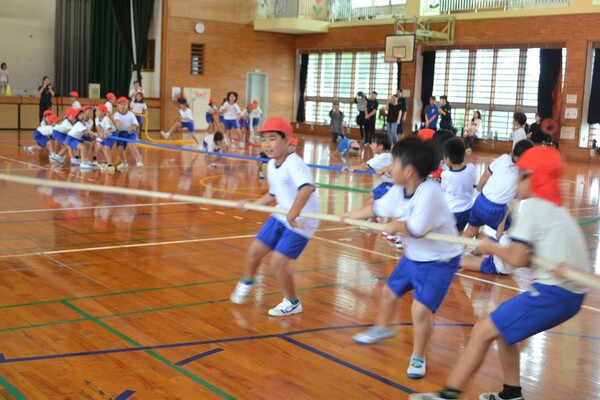 準備運動の後は、親子対抗のドッジボール、組対抗の5色綱引き(子供と大人は別々に)、魔法の絨毯で楽しいひとときを過ごしました。