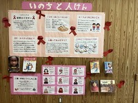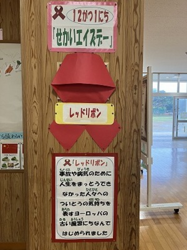 先週の全校朝会から、世界エイズデーに関する学習をしています。今日は、みんなレッドリボン運動について考える一日です。
