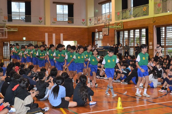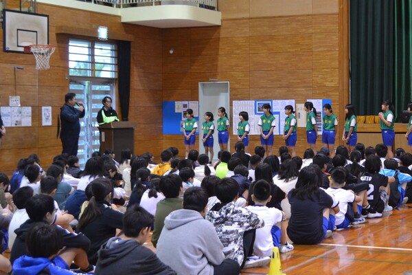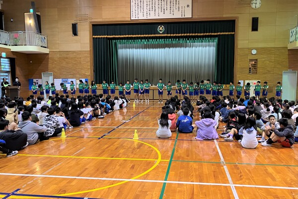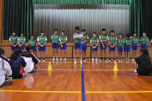 全校朝会で、選手の激励会を行いました。