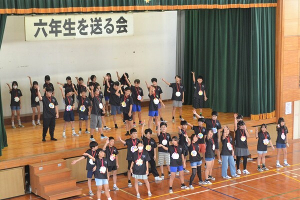 1年生のプレゼントをはじめ、各学年がメッセージと出し物で6年生を送り出します。