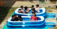 幼稚園では、子ども達が簡易プールで水遊びを満喫していました!