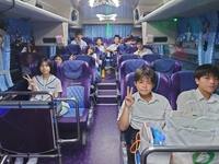 今日は4時半にモーニングコールの5時集合でしたが、昨日はなかなか眠れなかったのか、5時に起きる生徒も…。それでも全員出発前には集合して、現在朝日を背にしながら空港へ向かっております。