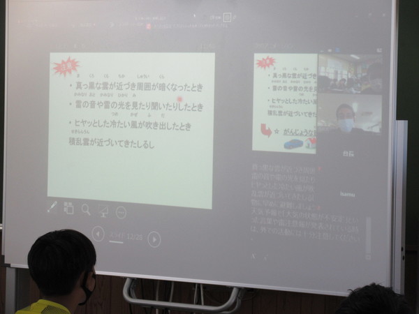 授業テーマは、「雲と天気の変化」です。子供たちは、身近な台風の講話をしっかりと聞き取り積極的に質問をすることで気象情報に興味を持つことができました。