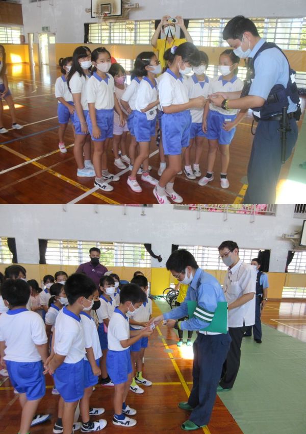 自転車車体の点検箇所の覚え方を「ひかるぶたはしゃべる」で表現したり、ヘルメットのかぶり方や交通安全ルールについて、3年生に分かりやすく伝えてくれました。特に危ない交差点については、みんなで確認の仕方を実技指導してもらいました。