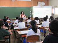 *ALTとは日本語では「外国語指導助手」と呼ばれています。ここで言う「外国語」は英語のことを指しています。基本的には授業において、英語専科の平良 悦子先生や学級担任の補助が役割となっています。悦子先生や学級担任とALTが一緒に授業を行うことで、よりきめ細かく、個人に合った指導をすることがねらいです。(授業は、毎週木曜日に悦子先生と来校します。)