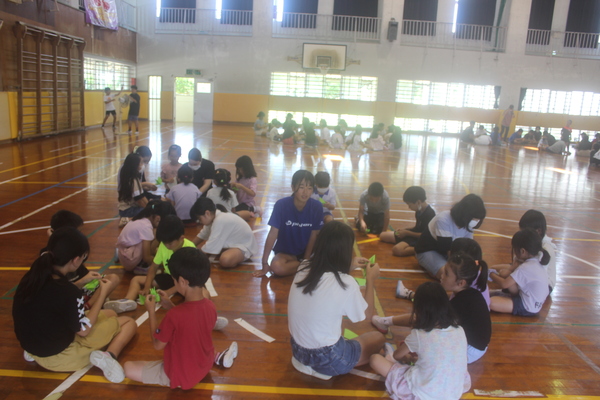 6月6日(火) 平和月間に入った下地小学校。 昼休みに体育館に集まって、委員会主催の千羽鶴折りを行いました。