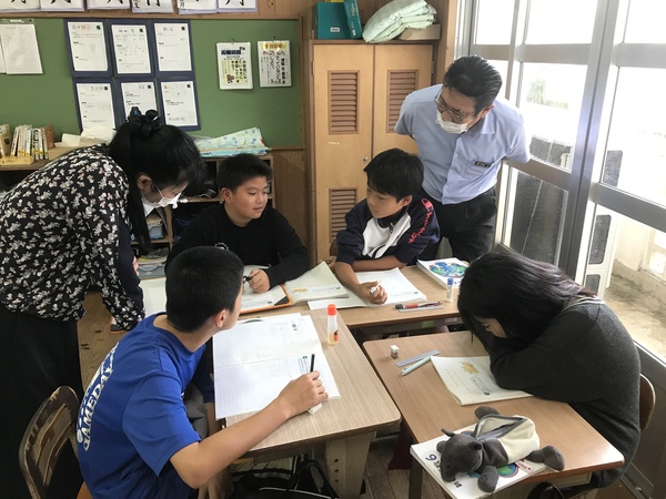 単元は「角柱と円柱の体積」です。子ども達がグループに分かれ、考えを出し合い、全体の場に出していきました。図形について、既習事項を活用して、各々の考えで答えを出していきます。自分の考えを、図や指揮を提示しながら友達に説明したり、友達の説明を自分の考えの共通点や相違点を考えながら聞く事を通して考えを深めていきました。