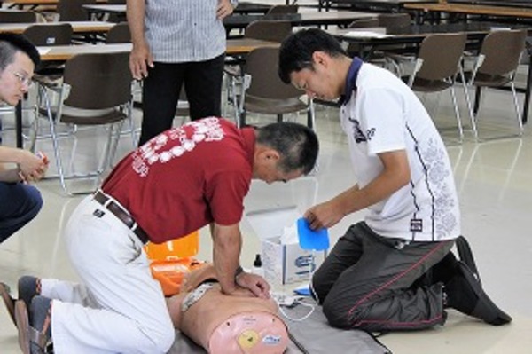 宮古島市消防の職員に来ていただいて、救急救命の初級とAEDの使い方を教えてもらいました。